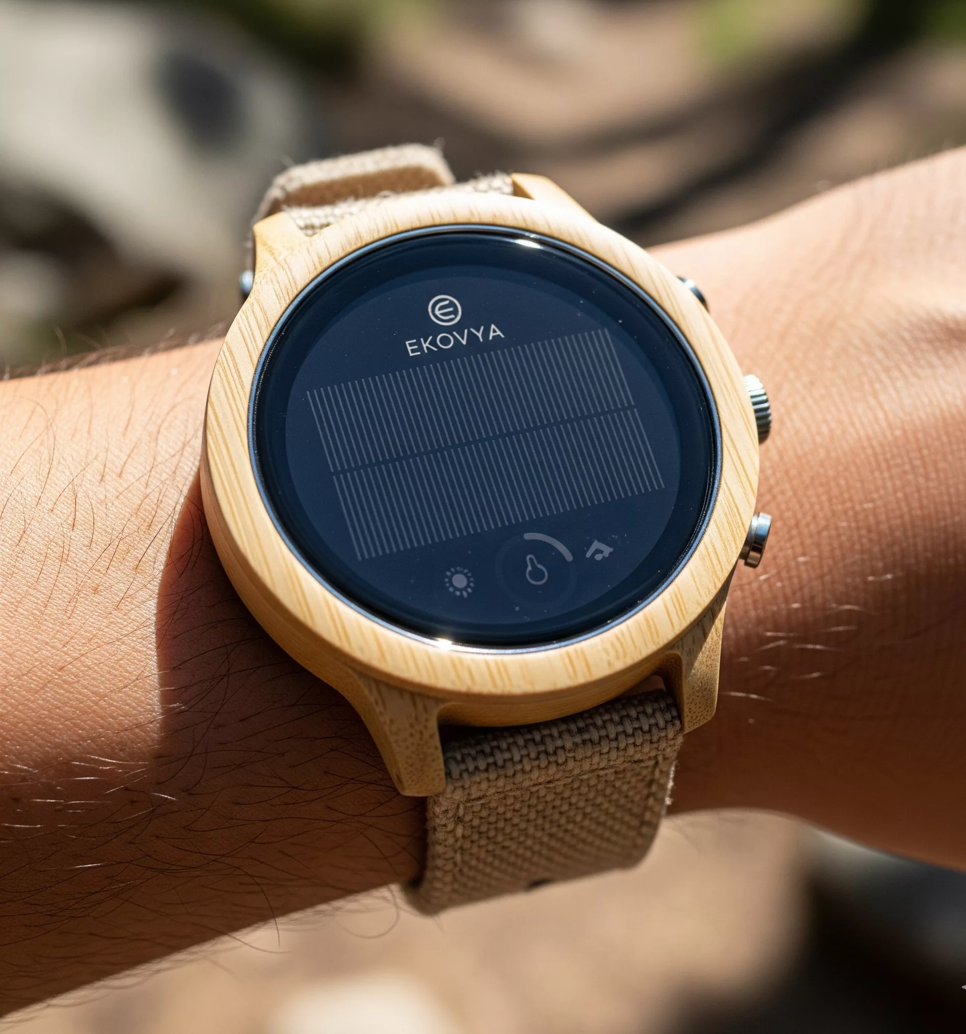 Ekovya Terra Glow Solar Smartwatch – Eco-Friendly Bamboo & Cork